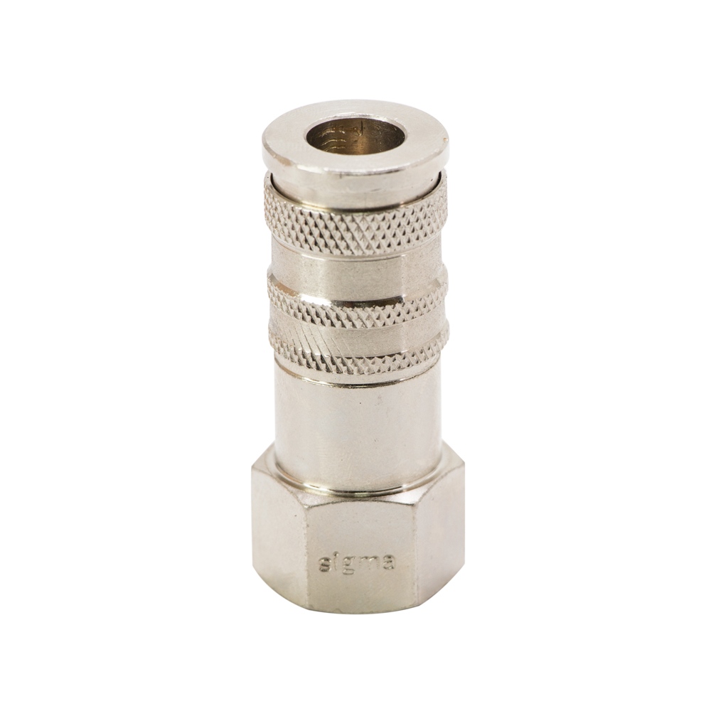 З'єднання швидкознімне посилене з внутрішнім різьбленням ½" Sigma (7021461) і автоматичним клапаном, що перекриває канал подачі повітря. З'єднання призначене для встановлення на виході різних елементів пневмосистеми і створення автоматичного переривання подачі повітря. Завдяки спеціальній посиленій конструкції дані з'єднання мають високу зносостійкість. сталі виключає можливість появи корозії.