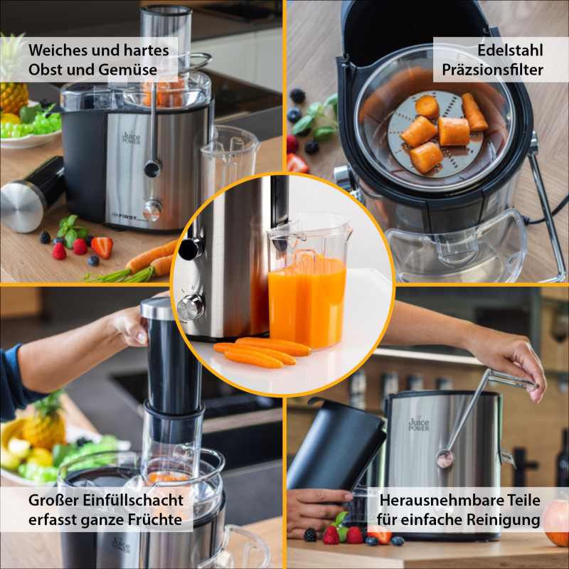 Чи хочете ви сісти на сокову дієту або просто насолоджуватися свіжим соком кожен день - цей компактний соковитискач зробить це можливим. Перетворіть ваші улюблені овочі або фрукти на смачний, корисний сік швидко і без зусиль. Високопродуктивний блендер працює із потужною вихідною потужністю 800 Вт і може регулюватися на двох рівнях швидкості. Завдяки практичному поворотному перемикачу соковитискач надзвичайно простий у використанні. Сучасний дизайн кухонного помічника переконує сталлю/чорним кольором та є обов’язковим для вашої кухні!