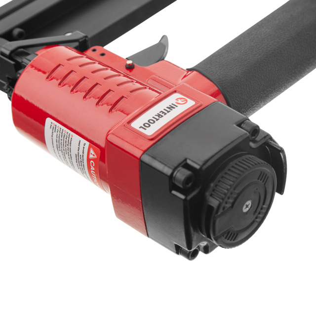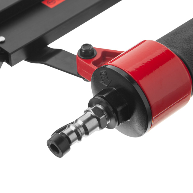 Пневмостеплер має дуже компактну та легку конструкцію, вагою 1,8 кг, не перевантажує руки, тому ним комфортно працювати протягом тривалого часу. Прогумована ручка забезпечує відмінну фіксацію інструмента в руці. Також у степлері передбачена можливість регулювання напрямку викиду повітря для більш зручної та безпечної роботи.