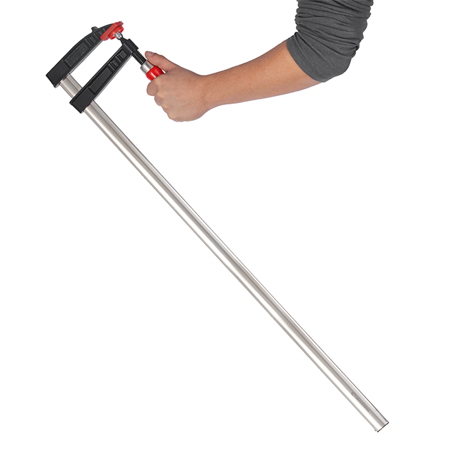 Основа виготовлена з міцної сталевої напрямної, ручка дерев'яна. Завдяки пластиковому наконечнику на затискних губках гарантований захист деталей, що затискаються, від механічних пошкоджень, подряпин.