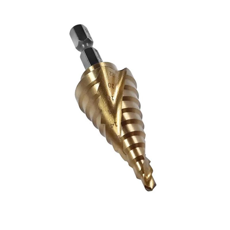 Свердло по металу S&R ступінчасте - призначене свердління та зняття фаски в металі та нержавіючій сталі. Свердло виготовлене із швидкорізальної сталі. Титанове покриття збільшує ресурс роботи свердл та забезпечує тривалий термін експлуатації. Має дві широкі спіралі для виведення стружки.