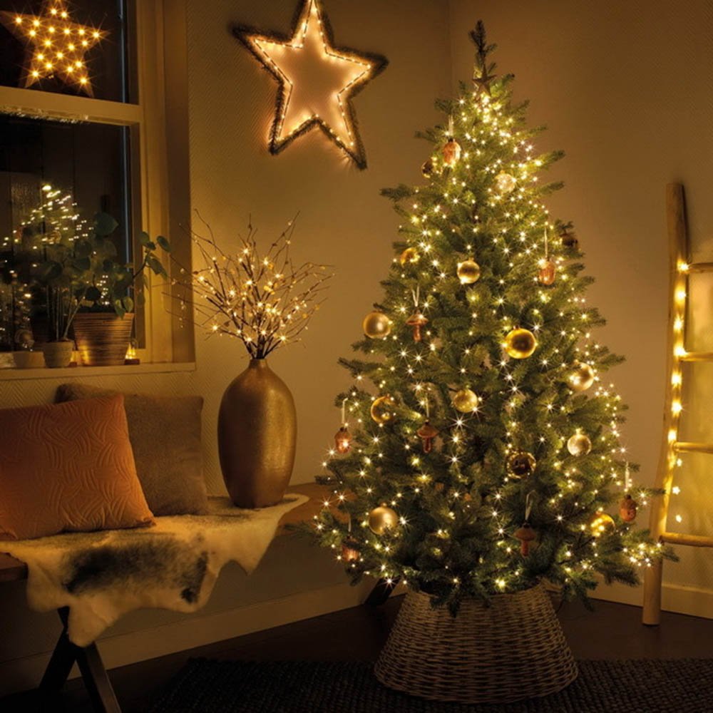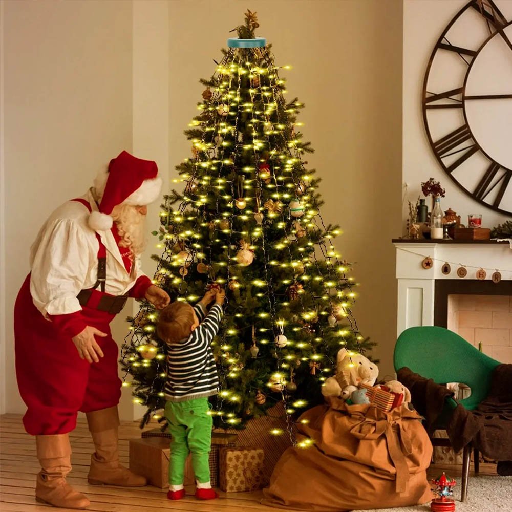 Елегантний дизайн: Гірлянда «Каскад» призначена для розміщення на верхівці ялинки, створюючи 7 вертикальних променів по 1,5 метра, кожен прикрашений 14 світлодіодами, що випромінюють тепле жовте світло.