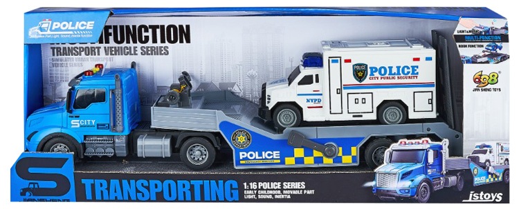 Трал 1:16 має звукві та світлові ефекти, інерційну функцію, на кабіні ватажівки є кнопки. В набір входить інерційна поліцейська вантажівка. Живлення: 3 батарейки типу AG13 (у комплекті). Упаковка: відкрита коробка.