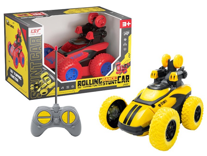 Трюковий автомобіль з функцією 360 ? перевороту в т.ч. на місці на р/у (10 м) має світлові та звукові ефекти, в асортименті 2 види. Живлення: літієва батарея (у комплекті). Розмір іграшки: 12*11*11 см. Упаковка: відкрита коробка.