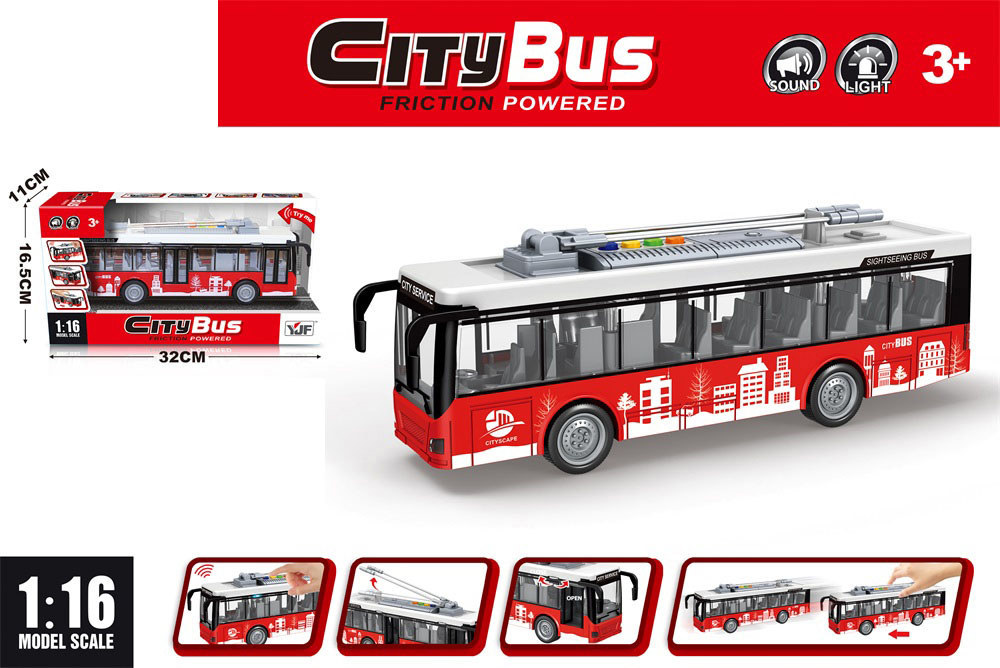 Інерційний екскурсійний тролейбус зі звуковими та світловими ефектами, дверцята відкриваються. Матеріал: пластик. Живлення: батарейки. Вік: від 3 років. Упаковка: відкрита коробка.