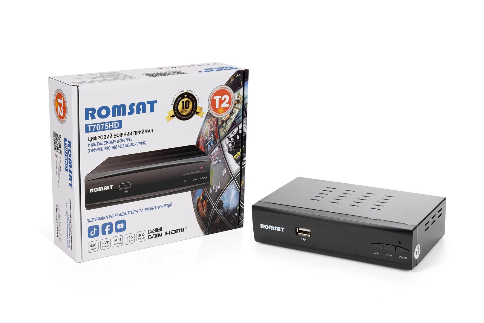Romsat T7070HD – це сучасний цифровий ефірний приймач для перегляду телеканалів у форматі DVB-T2 (стандарт ефірного телебачення). Завдяки високій якості зображення у форматі HD (High Definition) та широкій функціональності, цей приймач забезпечує максимальний комфорт під час перегляду телепередач.