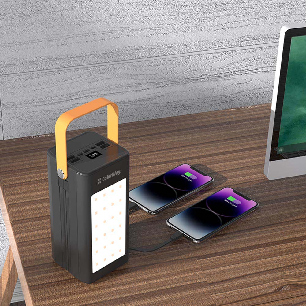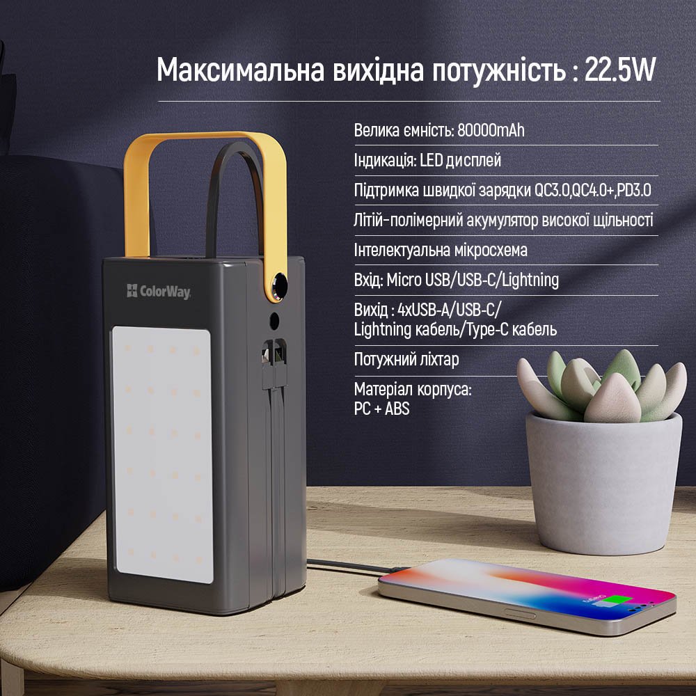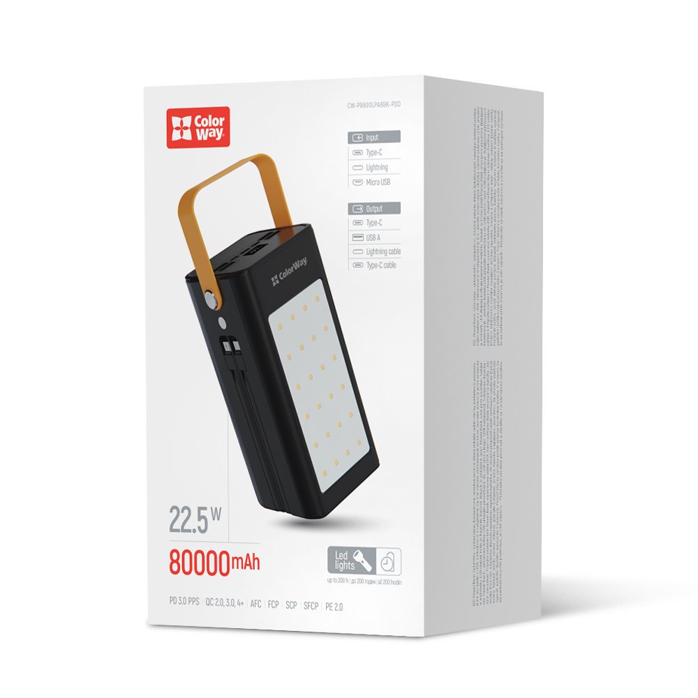 Зовнішній мобільний акумулятор ColorWay на 80000mAh – це надійне рішення для живлення ваших гаджетів у будь-яких умовах. Завдяки великій місткості ви зможете кілька днів користуватися пристроями без підзарядки, що особливо зручно під час подорожей, походів або перебоїв у електропостачанні. Потужність до 22.5 Вт забезпечує швидке заряджання смартфонів та інших пристроїв, а підтримка сучасних протоколів (Power Delivery 3.0, Quick Charge 2.0/3.0/4.0+, Huawei Fast Charge, Huawei Super Charge, Samsung Fast Charge, Apple Fast Charge, MTK-PE+ 2.0) гарантує високу ефективність. Акумулятор оснащений роз’ємами Type-C, Lightning, micro USB та 5 вихідними портами (4xUSB-A, Type-C), а також двома вбудованими кабелями Lightning та Type-C довжиною 15 см, що усуває необхідність у додаткових аксесуарах. Можливість одночасно заряджати до 7 пристроїв робить цей павербанк незамінним як у повсякденному житті, так і під час подорожей. Інтегрований LED-дисплей дозволяє легко відслідковувати рівень заряду, а силіконовий шнурок забезпечує зручність кріплення до рюкзака чи сумки. Для вашої безпеки пристрій має захист від перегріву, перезаряду, глибокого розряду, перевантаження та короткого замикання. Додатково павербанк оснащений потужним ліхтарем, що стане в нагоді під час кемпінгу або активного відпочинку. ColorWay 80000mAh – це ідеальне рішення, яке забезпечує безперервний доступ до енергії та світла, де б ви не знаходилися.