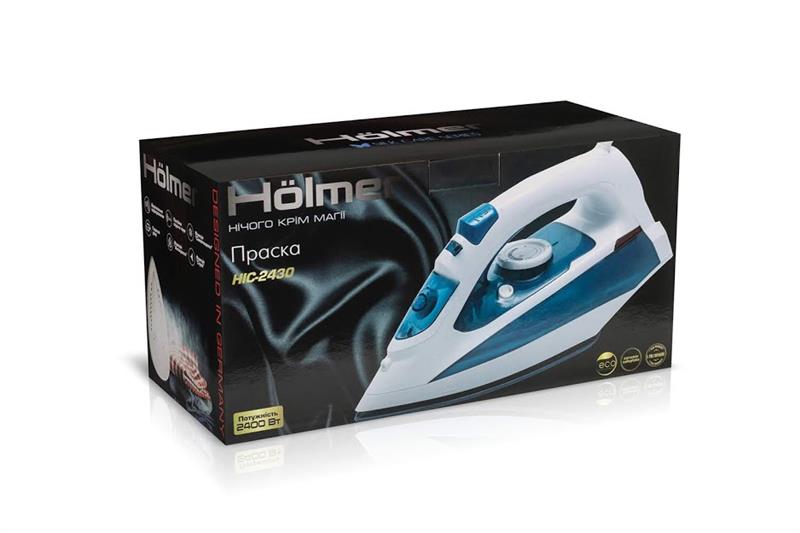 Праска Holmer HIC-2538 має витончений дизайн у білому кольорі із вставками синього кольору. Праска має потужність 2400 Вт, паровий удар 120 г/хв та постійну подачу пари 30 г/хв, а також керамічне покриття, забезпечить максимально комфортне прасування та допомагає розгладити навіть найскладніші складки. З функцією «Антикрапля» жодна крапля не потрапить на тканину. Функція «Вертикальна пара» дозволить легко відпарювати делікатні тканини, наприклад штори або костюми.
