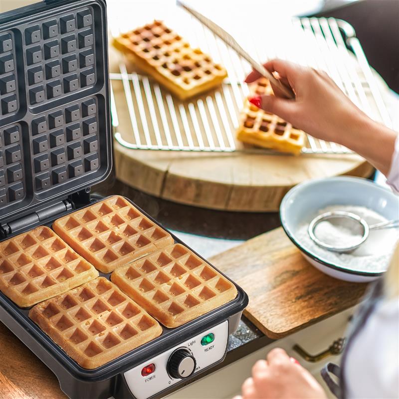 Вафельниця First FA-5305-3 - хороший вибір для будь-якого користувача, який бажає самостійно готувати смачні свіжі вафлі. First FA-5305-3 виконана у вигляді ергономічної конструкції, яка не викличе труднощів у процесі експлуатації та під час обслуговування. У даній моделі передбачена можливість одночасного приготування 4 шматочків вафель, при цьому розмір робочої поверхні становить 22х22 см. Добре впорається зі своїм завданням передбачене в цій моделі антипригарне покриття, яке не допустить пригорання і полегшить догляд за робочою поверхнею приладу. Крім цього, в First FA-5305-3 передбачено плавно регульований термостат, світлова індикація і ефективний захист від перегріву, що дозволяє уникнути неприємних і небезпечних ситуацій.
