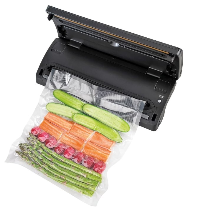 Тепер можна підготувати продукти до зберігання простим натисканням кнопки. Незалежно від того, потрібне звичайне чи вакуумне запечатування продуктів, машина зробить це для вас. Просто покладіть продукти в спеціальний пакет і натисніть кнопку запечатування або вакуумного запечатування. У другому варіанті прилад видалить повітря навколо продукту, а про завершення процесу запечатування сповістить вимкнення індикатора вакуумування. Коли пакет герметично запечатаний, їжа захищена від забруднень.