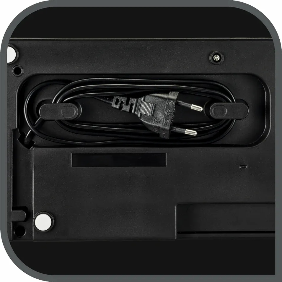 Заднє розташування шнура та можливість вертикального розташування полегшують зберігання та економлять місце на стільниці.