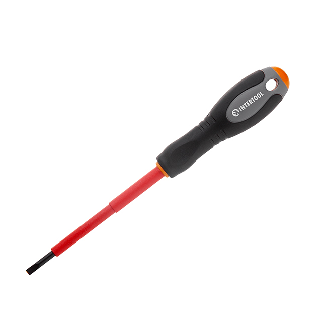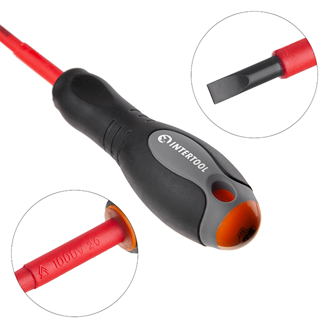 Електроізольована викрутка INTERTOOL призначена для безпечної та зручної роботи з електромережами, запобіжниками, перемикачами та різними приладами, під напругою до 1000 В.