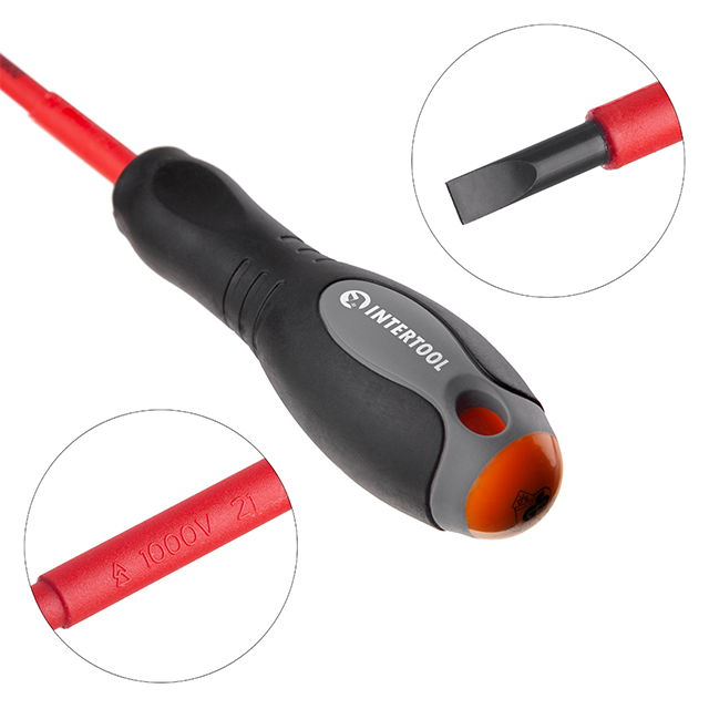 Електроізольована викрутка INTERTOOL призначена для безпечної та зручної роботи з електромережами, запобіжниками, перемикачами та різними приладами, під напругою до 1000 В.