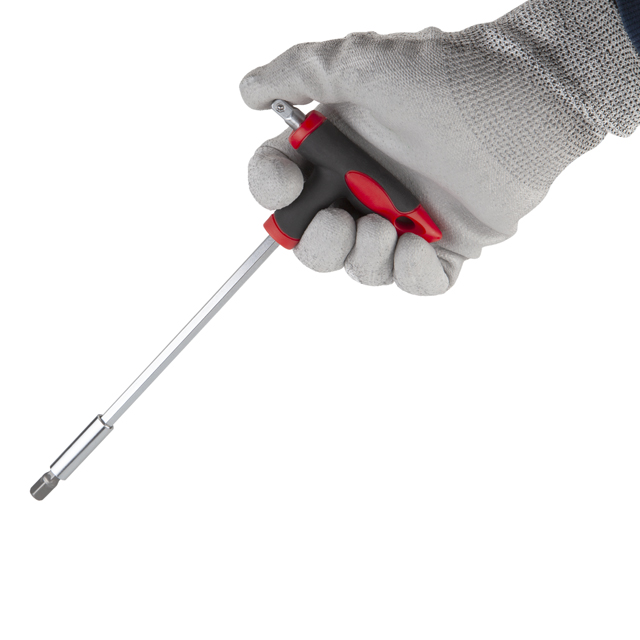 Т-подібна форма викрутки забезпечує максимальну ефективність від докладеного зусилля. Двокомпонентна рукоятка гарантує відмінне зчеплення навіть з вологими або слизькими руками завдяки гумовим вставкам. Подовжена основа дозволяє працювати у важкодоступних місцях, куди не дістане звичайна викрутка.