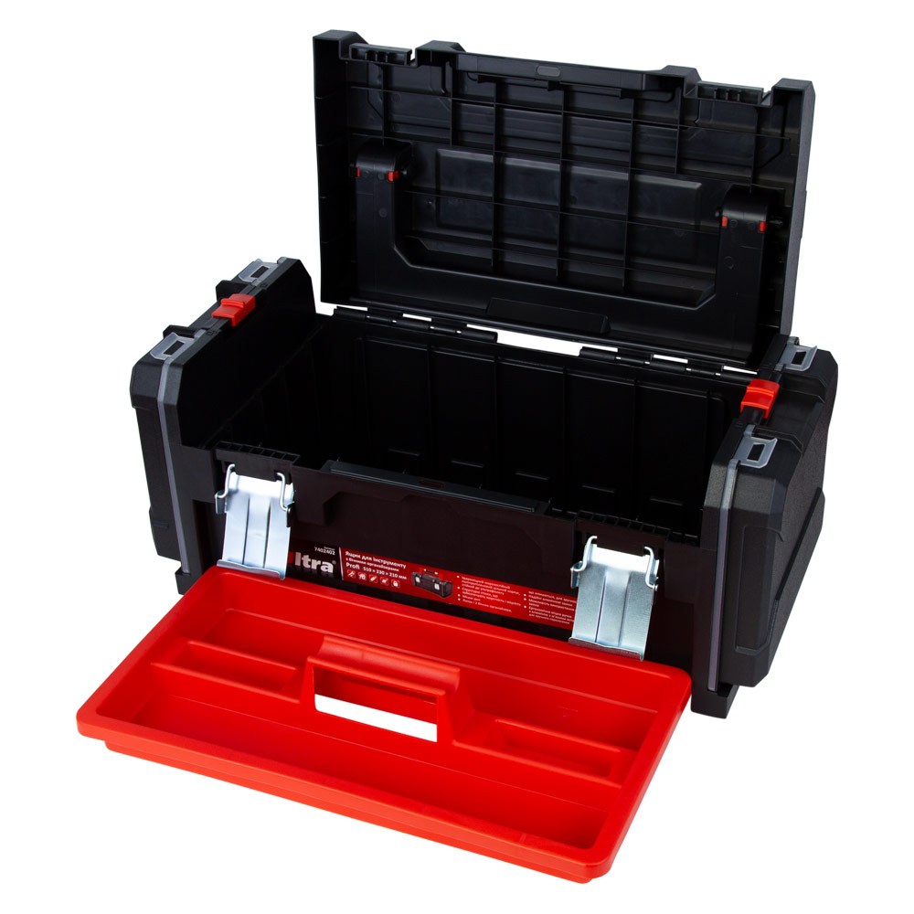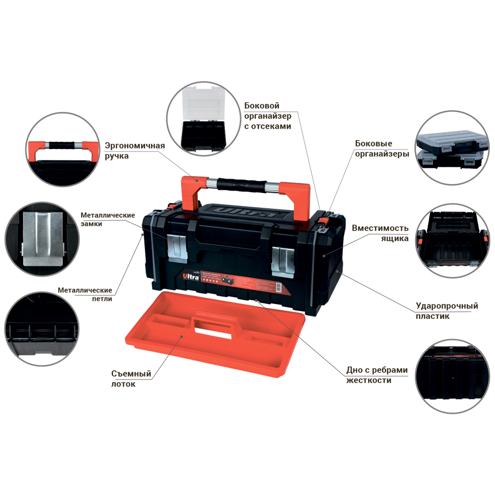 Ящик для інструментів з бічними органайзерами Profi 510×230×210мм ULTRA (7402402) призначений для зберігання, транспортування, перенесення та зручного доступу до ручного інструменту. Допомагає системно організувати зберігання дрібних деталей: кріплення, шайб, гайок та інших дрібниць. Простота пошуку необхідних деталей забезпечується наявністю кількох секцій.