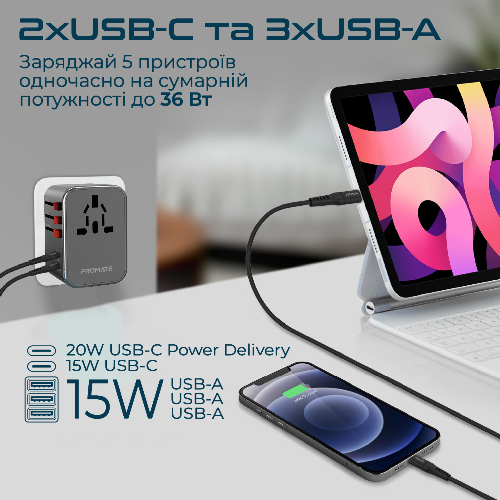 Ще більше потужності, ще функціональності. TripMate-36W - поліпшена версія популярного дорожнього адаптера TripMate-33W від компанії Promate. Залишайся зарядженим у будь-якій точці світу. Особливості: - Універсальний перехідник: EU/US/UK/AU стандарти на вході та виході. Просто змісти перемикач для вибору необхідного штекера та підключай будь-який пристрій в будь-яку розетку - Пропускна здатність 1840 Вт: Дозволяє використовувати енерговитратні побутові прилади, такі як фени, праски та електрочайники - 20 Вт USB-C порт: З підтримкою технології Power Delivery, працює у трьох режимах: 5В/3А, 9В/2.22А, 12В/1.67A - 15 Вт USB-C порт: Заряджай смартфон, планшет або повербанк на потужності до 15 Вт - 3 порти USB-А: Гарантують максимальну швидкість зарядки для ґаджетів, не обладнаних технологією Quick Charge. Сумарна потужність USB-A портів 15.5 Вт (5В/2.4А, 5В/3.1А max) - Вбудований запобіжник: Зупинить подачу живлення на підключені пристрої під час стрибка напруги - Безпека: Чіп Smart IC захистить TripMate-36W та підключені до нього пристрої від перегріву та надмірної зарядки - Першокласні матеріали: Надійний ґаджет з вогнетривкого ABS пластику має великий запас міцності - Компактний розмір: З габаритами 50x75x53 мм не займає багато місця при подорожах і не заважає іншим пристроям підключеним поруч